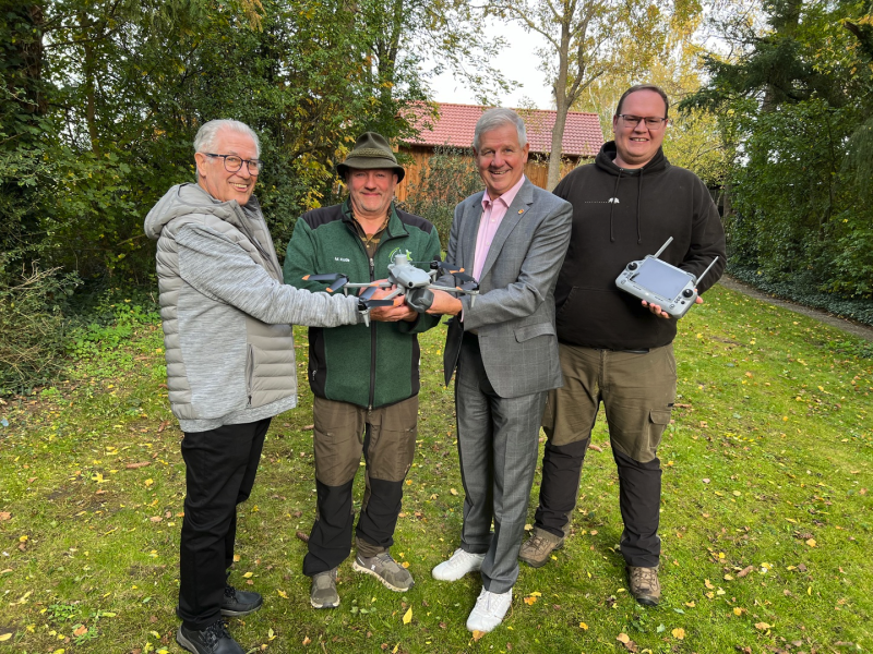 Bei der Übergabe (v.l.n.r.) waren Philipp Bohrer (Jagdgenossenschaft Süd), Mike Kude (Jagdpächter), Bürgermeister Helmut Glanzner sowie Leon Wiegand, Inhaber des Drohnenführerscheins, anwesend.